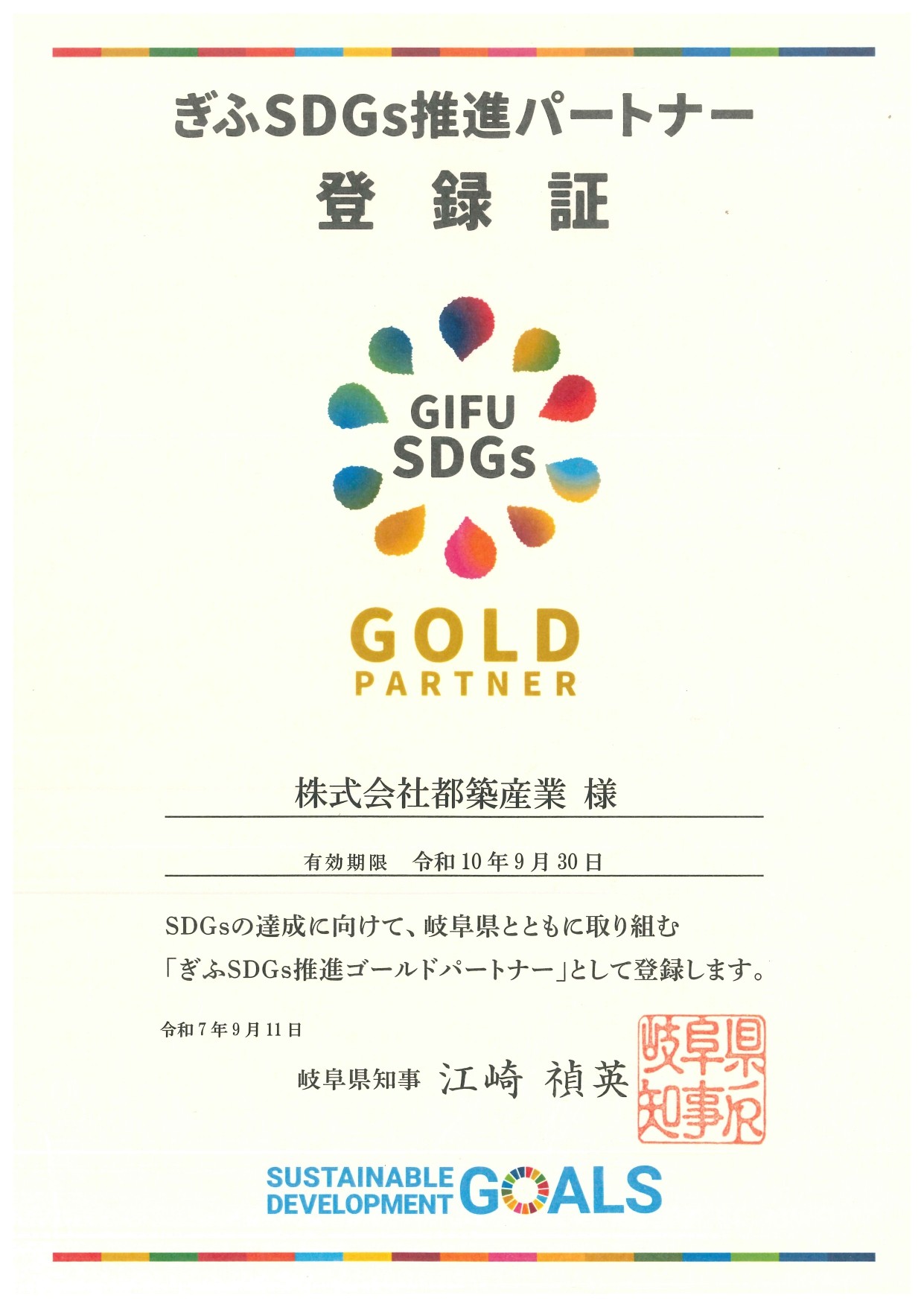 ぎふSDGs推進パートナー(ゴールドパートナー)に登録されました